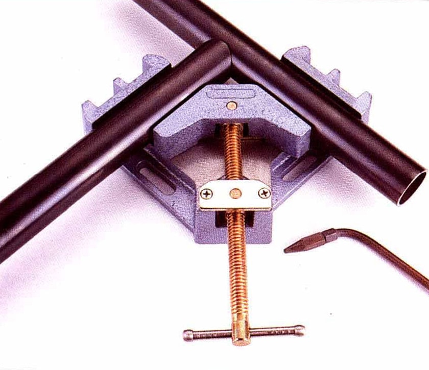 Vinkelskruestik af støbejern med bevægelig kæbe til justering af uregelmæssige emner. Kobberbelagt spændeskrue til forebyggelse af lopper under svejsearbejde. Maksimal åbning 100 mm.