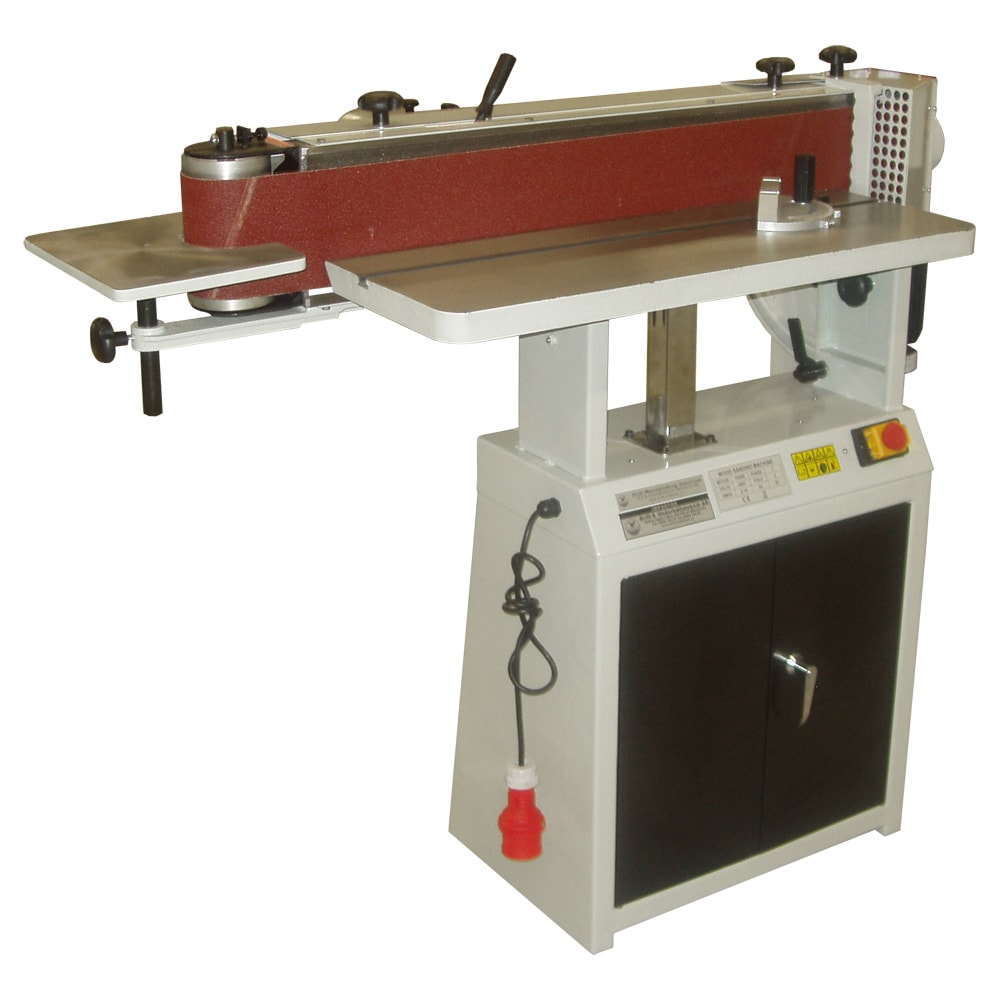 DUABs kraftige oscillerende båndpudser udstyret med et stærkt og langt arbejdsbord i støbejern, der kan hæves og sænkes. Slibebjælken kan vippes 90 grader. Leveres med geringsstop, sidebord til profilslibning og polering af runde overflader, spånplader, pudsebånd og stativ med opbevaringsskab.