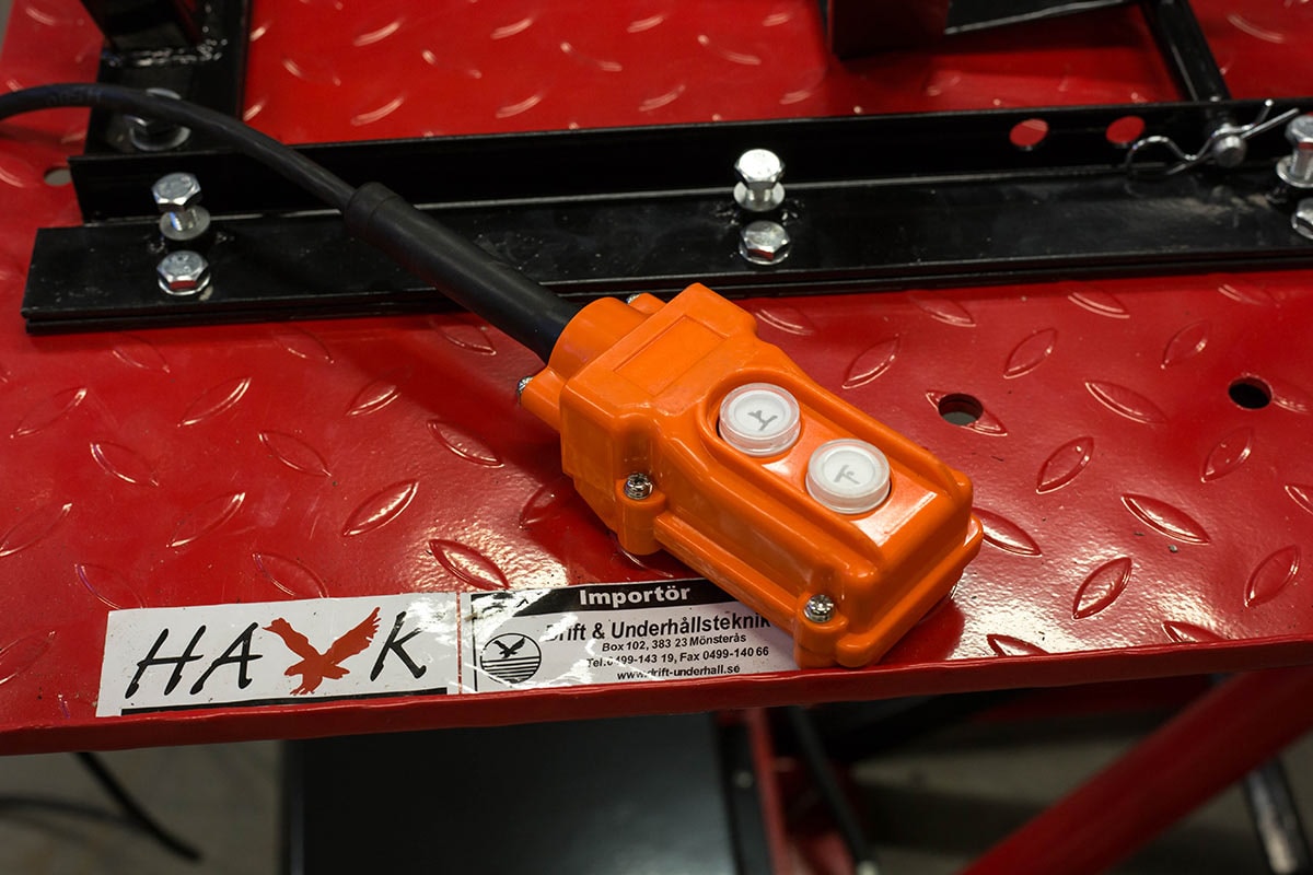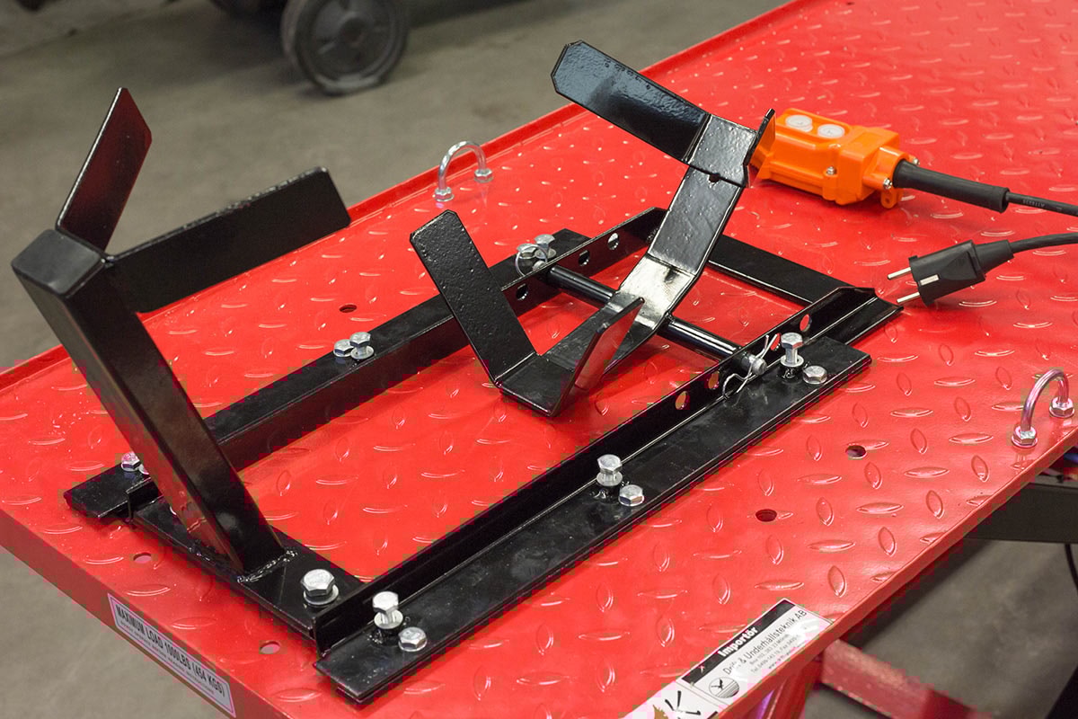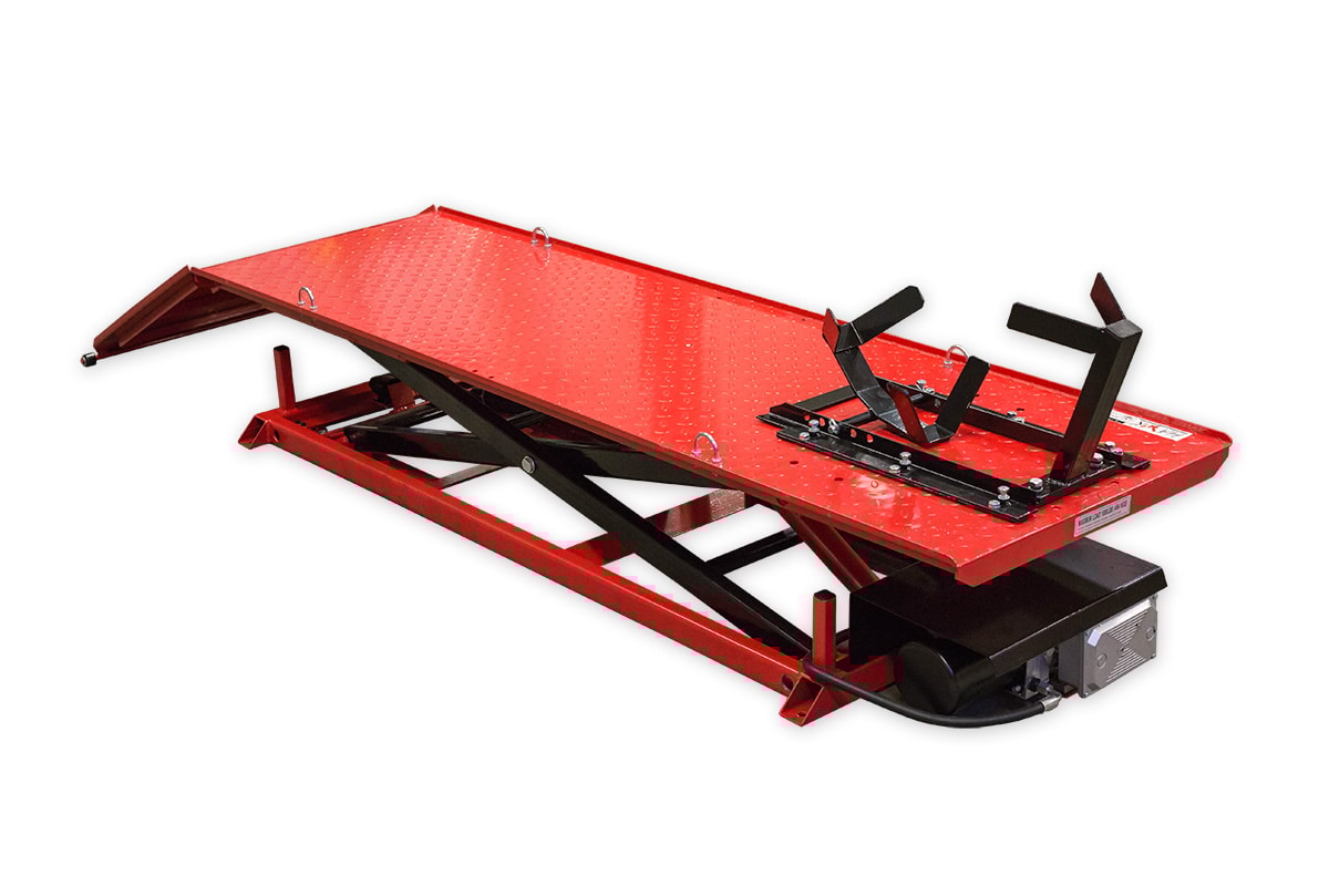 Professionel og stabil elektrisk hydraulisk motorcykellift i svejset stålkonstruktion. Motorcykelliften er af en sakseløft model, hvilket gør den ekstra stabil selv ved høje løft. Hævning og sænkning foregår gnidningsløst og gnidningsfrit med det elektriske hydrauliksystem, der betjenes med en håndbetjening. Løfteanordningen har en automatisk mekanisk låsning for øget sikkerhed ved arbejde med hævet platform. Motorcykelliften leveres komplet med surringsløkker og støtte og vugge til forhjulet.