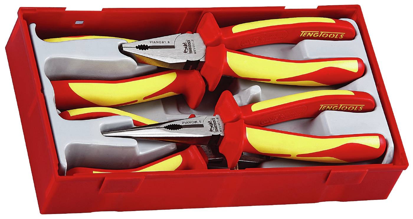 Sæt med 4 isolerede tænger. Fremstillet i henhold til standard IEC 60900 vedr. arbejde under spænding op til 1.000 V vekselstrøm (af specialuddannet personale).