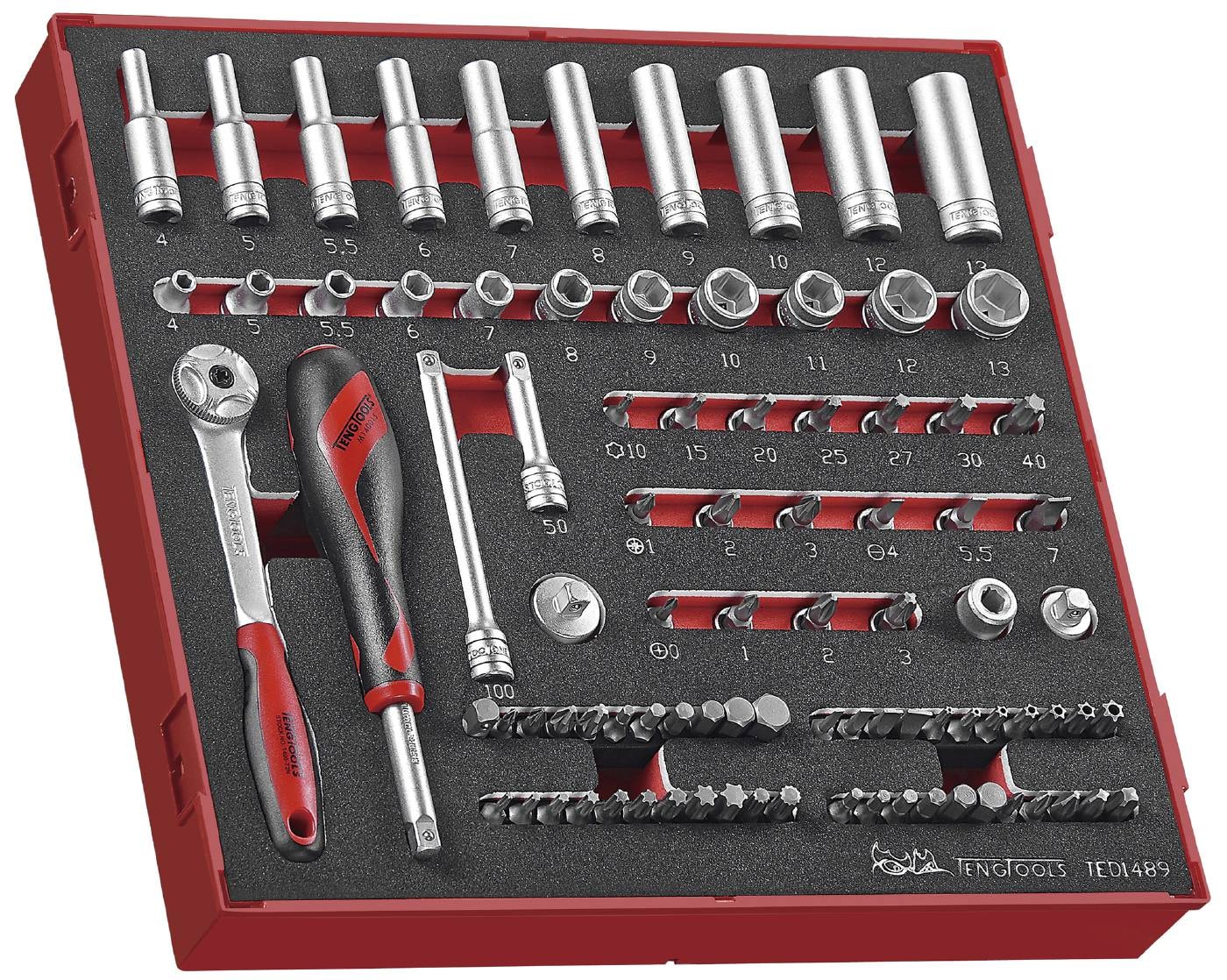 Leveres i indbygningsboks af plast med aftageligt låg. Værktøjet ligger i EVA-skum i tre forskelligt farvede lag. Boksene passer i Teng Tools’ værktøjskasser og vogne.