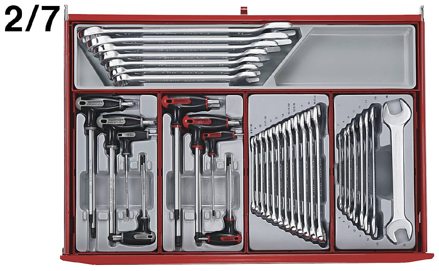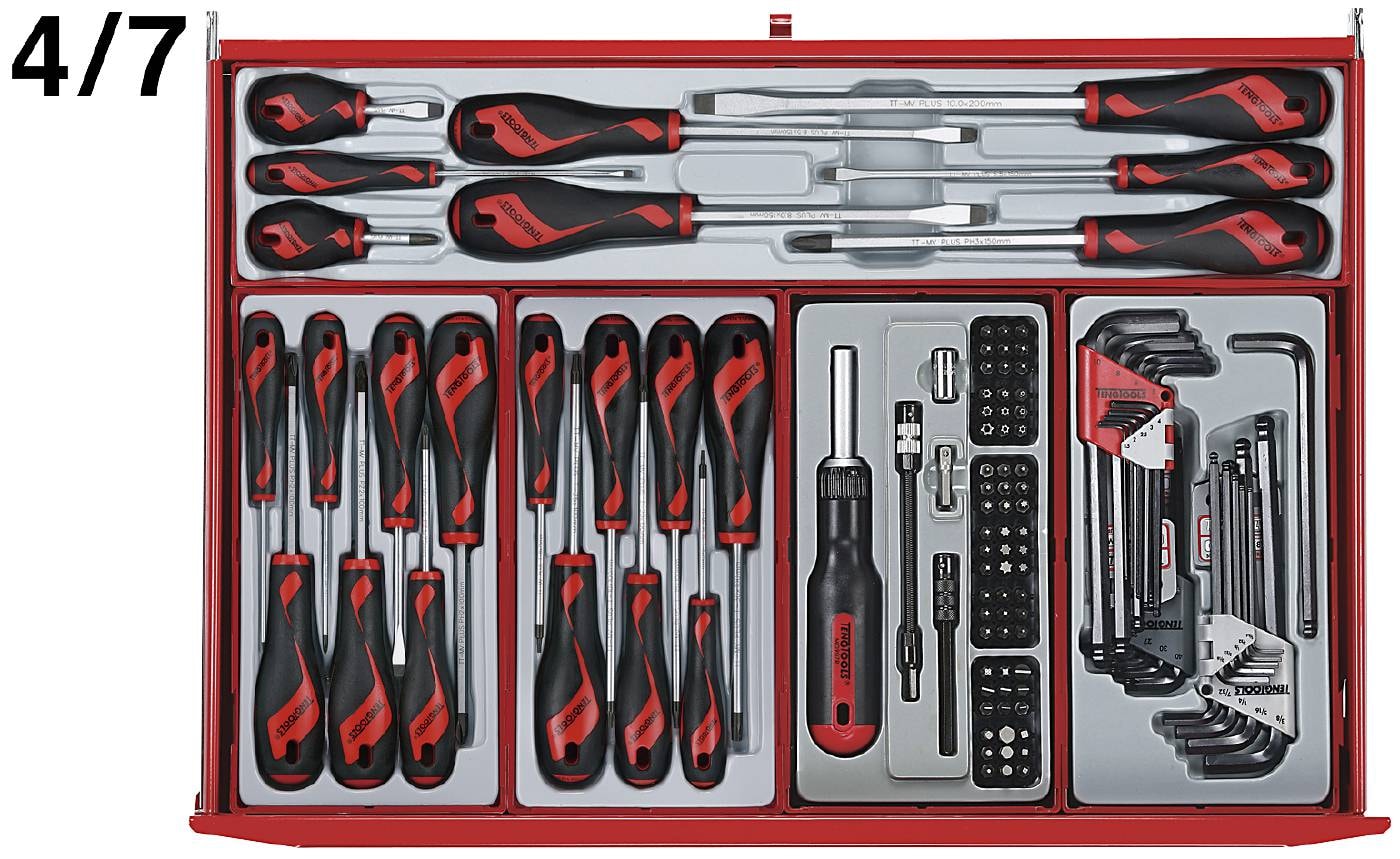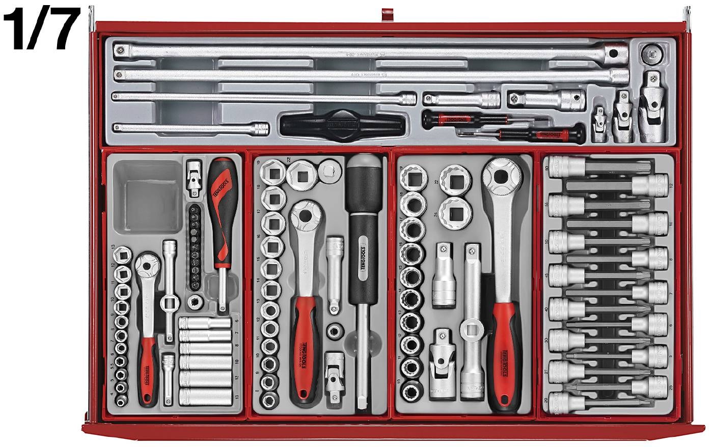 Værktøjssæt med 277 dele. Leveres i montørvogn TCW807SV BASIC. Vognen har 7 kuglelejrede udtræksskuffer.