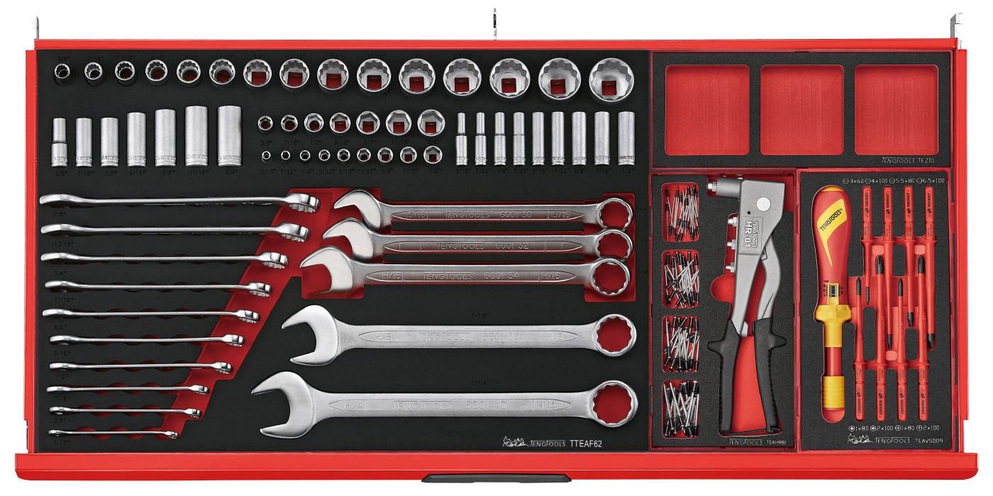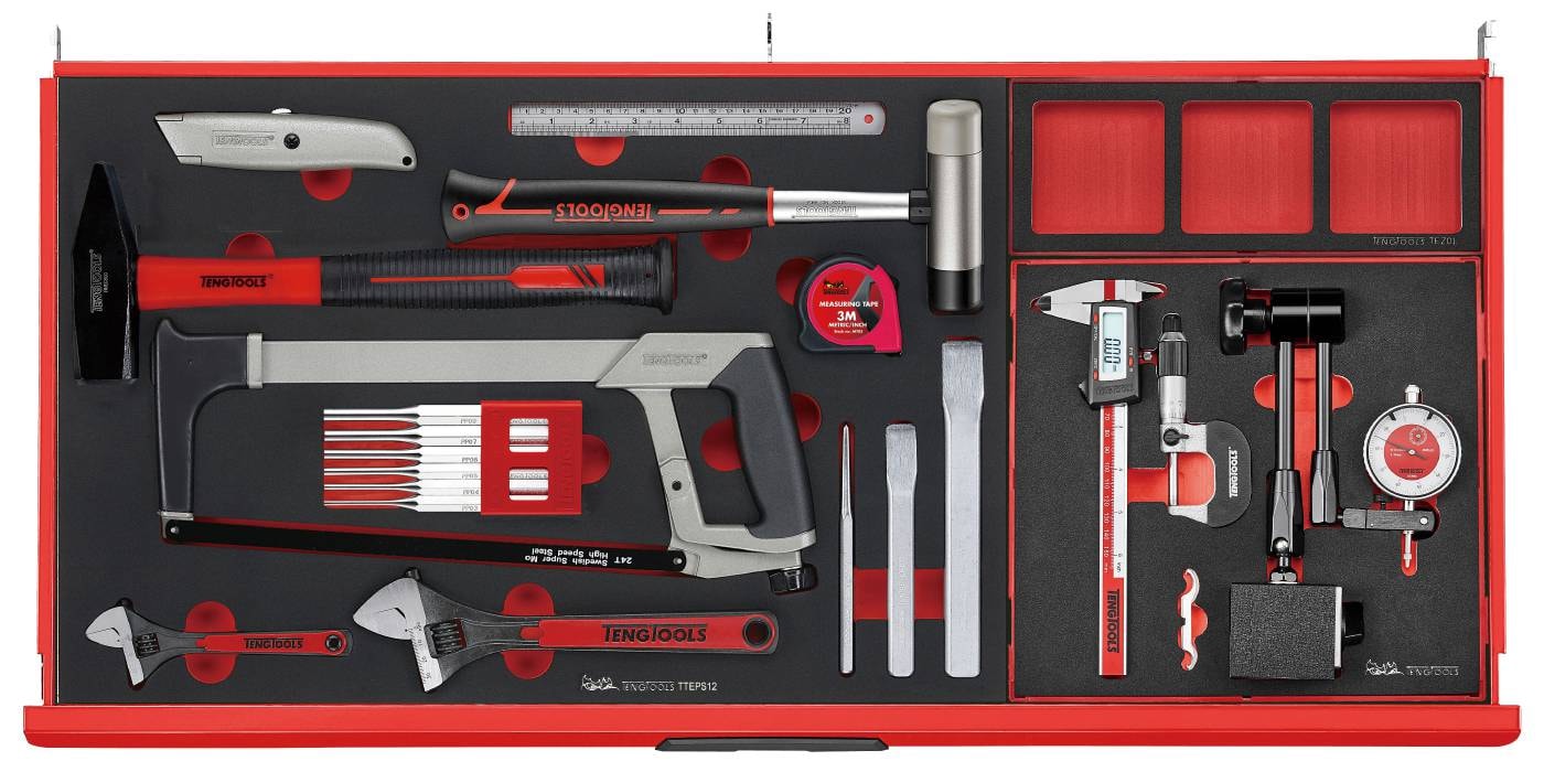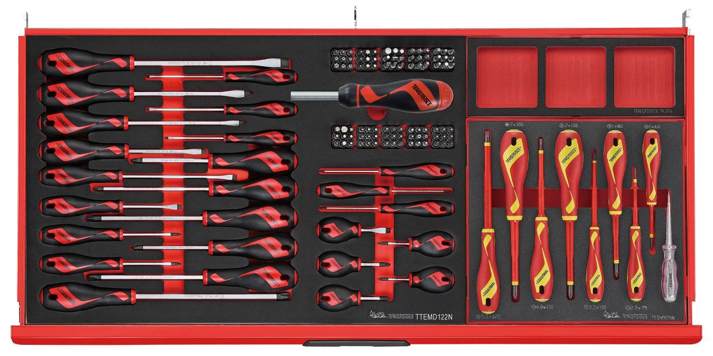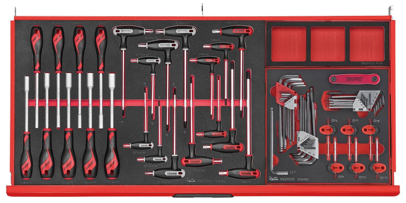 Alle i TengTools røde farve med det karakteristiske TengTools-logo med øjnene på den nedfældelige front på topboksen og den nederste skuffe i vognen.