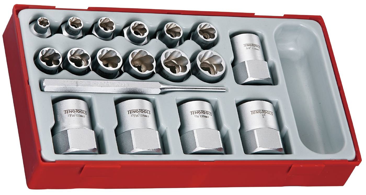 Sæt med 18 dele. Til at løsne beskadigede bolthoveder og møtrikker med. Indeholder sekskantudtrækkere med 3/8" og 1/2" firkantfatning samt en 4 mm cylindrisk drivdorn.