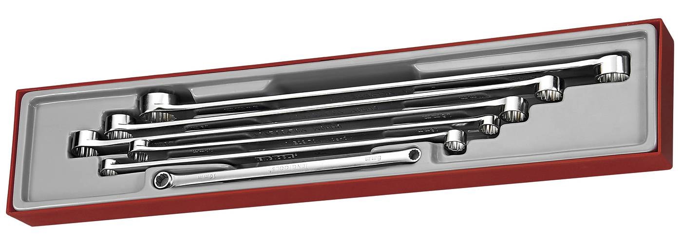 Ringnøglesæt med 6 ekstra lange flade nøgler. Dobbelte og med tolvkantede indbyrdes forskellige nøglevidder. Af krom-vanadiumstål. Matforkromede. Leveres i boks som passer i Teng Tools' vogne og skuffer.