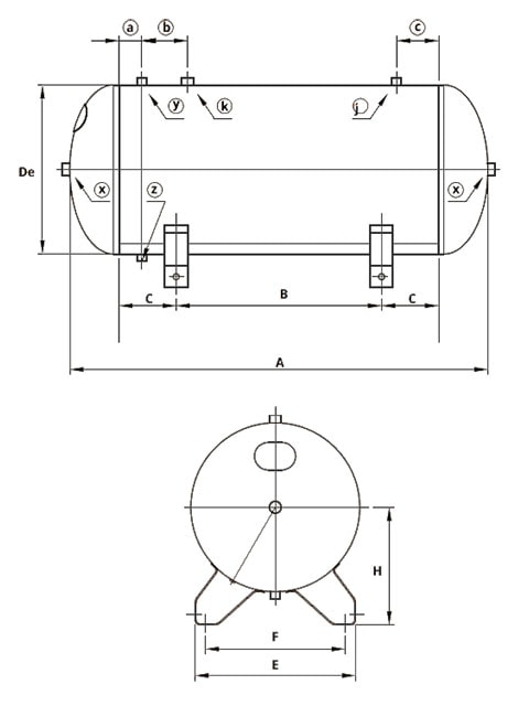 Drift-Air horisontal tryklufttank udstyret med bundplade til værksted og industri af høj kvalitet. Godkendt i henhold til direktiv 2014/29/EU. Alle rørforbindelser med indvendigt gevind.