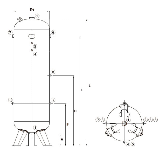 Højkvalitets vertikal tryklufttank til værksted og industri. Godkendt i henhold til direktiv 2014/29/EU. Alle rørforbindelser med indvendigt gevind.