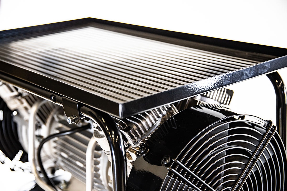 Takket være den kraftige motor, de fire cylindere og den store tank er der altid luft nok, selv for de mest kræsne brugere. De store luftgummihjul og det ergonomiske håndtag gør den let at flytte på trods af størrelsen. Aflastningshylden på toppen af kompressoren er udstyret med en skridsikker gummiklud.