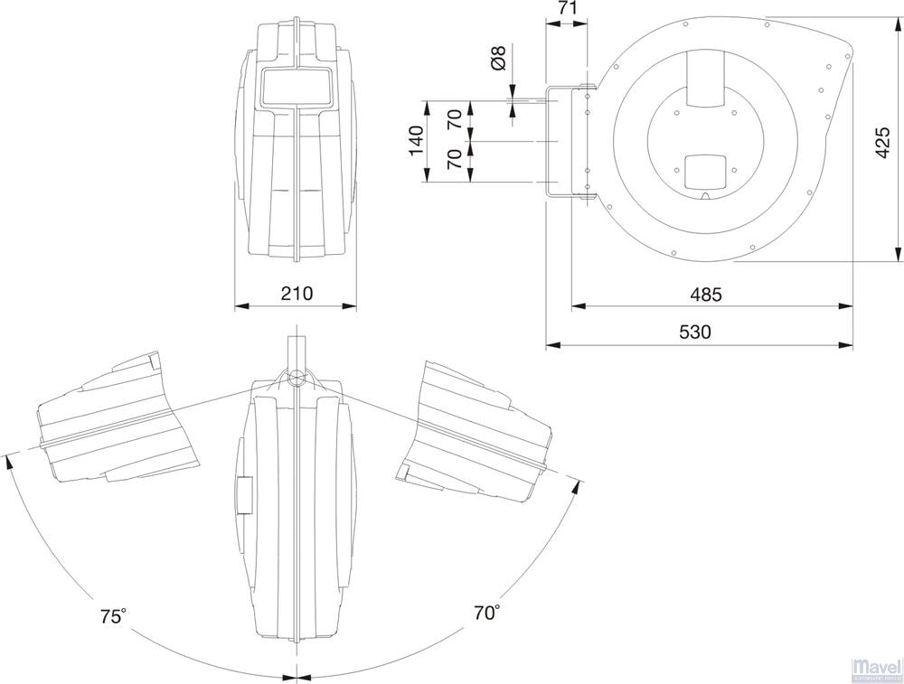Slangetromle til trykluft udstyret med automatisk optræk, 1 meter tilslutningsslange. Drejeligt vægbeslag til vægmontering. Slangen er lavet af polyurethan med en indvendig diameter på 12 mm. Slangetromlen kan også bruges til vand. Maksimal vandtemperatur, når tromlen udnyttes til vand, er 40 °C.