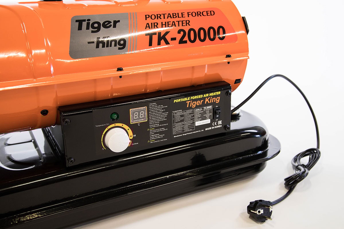 TK-20K er en bærbar dieselkanon uden skorsten, der drives af diesel. Udstyret med indbygget rumtermostat. Forbrændingskammer i rustfrit stål med automatisk køling. Fotocensor til flammekontrol og automatisk brænderstyring. Udstyret med sikkerhedstermostat og styreudstyr. Varmepistolen er nem at flytte takket være håndtaget på oversiden. Ideel til tørring på byggepladser og til opvarmning af velventilerede områder.